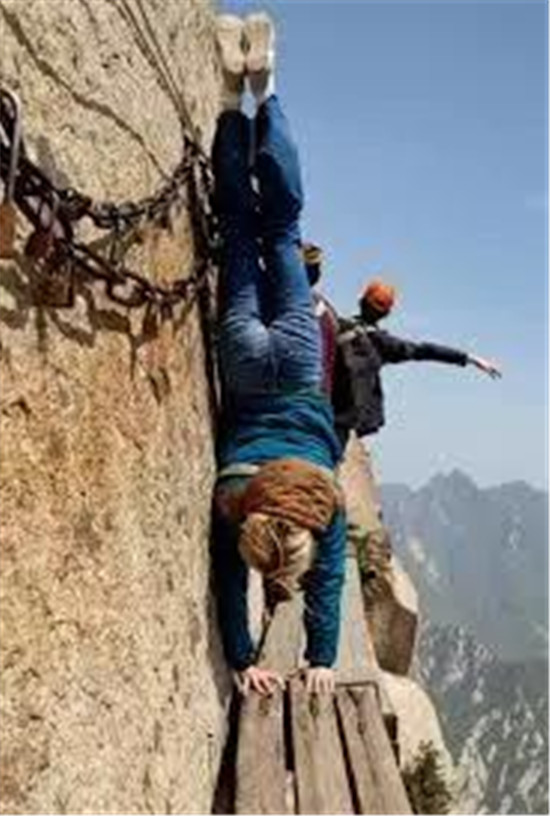 譯:可別往下看??!男士打破了登山運(yùn)動(dòng)最基本的規(guī)矩。就算害怕也無路可退啦。