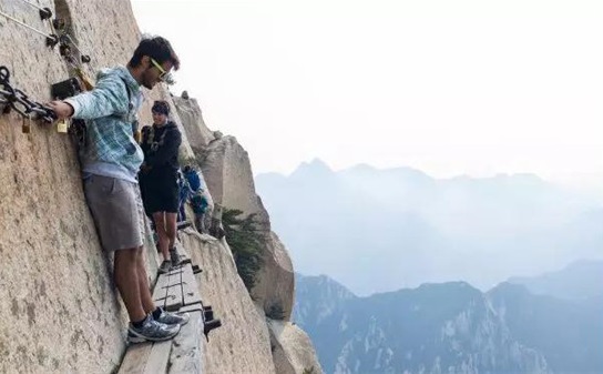 譯:不會有問題吧?游客攀登數(shù)千英尺高的中國名山,到達(dá)700年前修建的木棧道上。