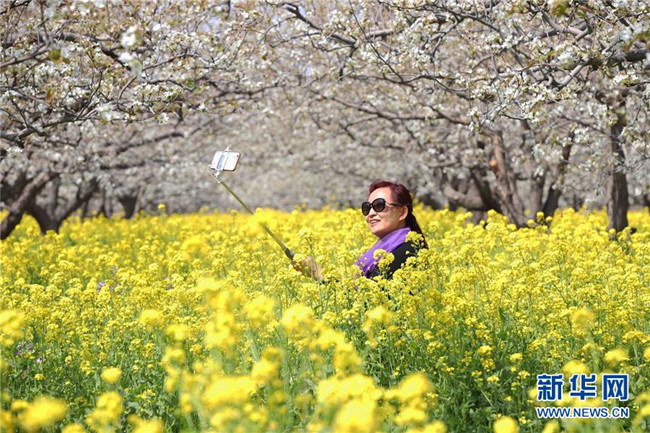 4月6日,在貴州六盤水盤州市烏蒙大草原景區(qū),游客在花海中自拍。清明時節(jié),人們外出旅游,踏青賞花,感受春天的美好。 新華社發(fā)(劉佳躍 攝)