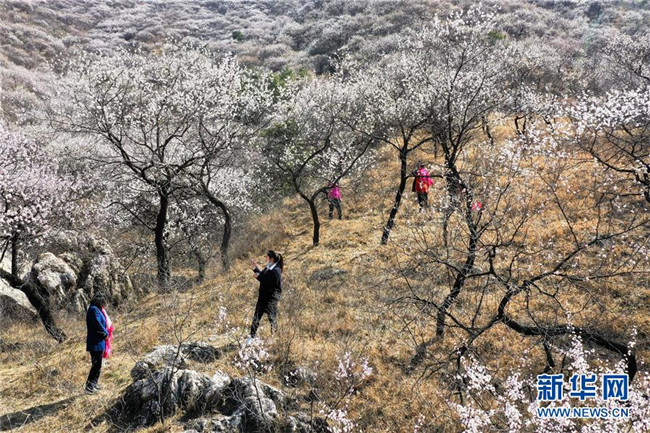 4月7日,游客在河北省遷西縣興城鎮(zhèn)杏花谷參觀(無人機拍攝)。清明時節(jié),人們外出旅游,踏青賞花,感受春天的美好。 新華社發(fā)(王愛軍 攝)