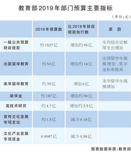 關(guān)于資金來(lái)源,教育部2019年部門(mén)預(yù)算顯示,2019年一般公共預(yù)算財(cái)政撥款約為1527億元,比上年執(zhí)行數(shù)增加約95億元。其主要原因?yàn)樯C合定額、出國(guó)留學(xué)經(jīng)費(fèi)以及學(xué)生資助工作專(zhuān)項(xiàng)等支出增加。