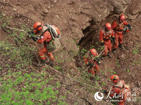 消防指戰(zhàn)員現(xiàn)場開辟臨時通道,采用繩索攀登的方式組織上山。(甘肅省森林消防總隊(duì)供圖)