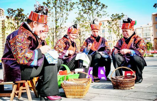 圖1:公交車開進(jìn)凱里市上馬石易地扶貧搬遷安置小區(qū)。圖2:凱里市上馬石易地扶貧搬遷安置點(diǎn)廣場上的繡娘。(凱里市宣傳部供圖)