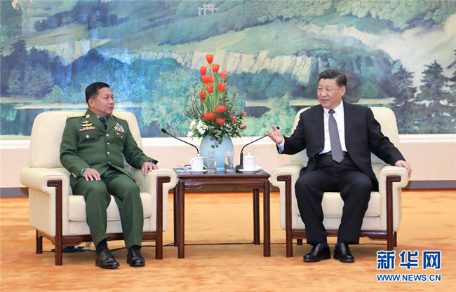 敏昂萊衷心感謝習近平主席撥冗會見。他說,緬中兩國有著悠久的傳統友誼,兩國兩軍關系始終保持良好發(fā)展。緬方感謝中方長期以來對緬國家和軍隊發(fā)展建設給予的寶貴支持,感謝中方支持緬國內和平進程。緬方歡迎、支持并愿積極參與“一帶一路”建設,加強與中方各領域務實合作,采取切實措施維護緬中邊境地區(qū)穩(wěn)定。