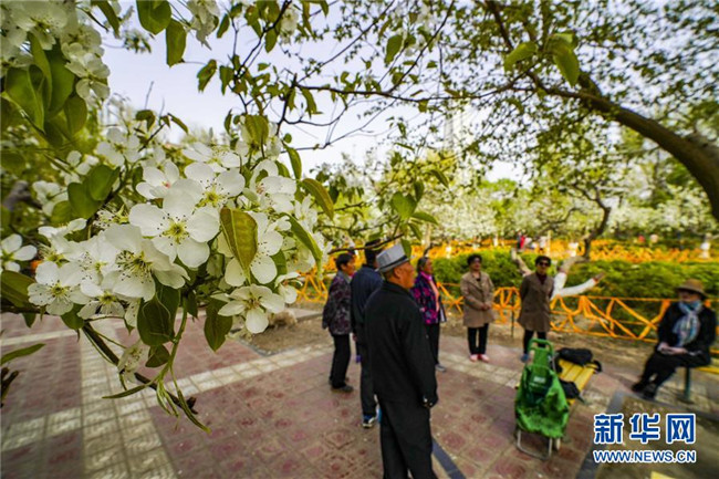 4月9日,在庫爾勒市梨香園,市民在盛開的梨樹下休閑娛樂。 新華社記者趙戈攝