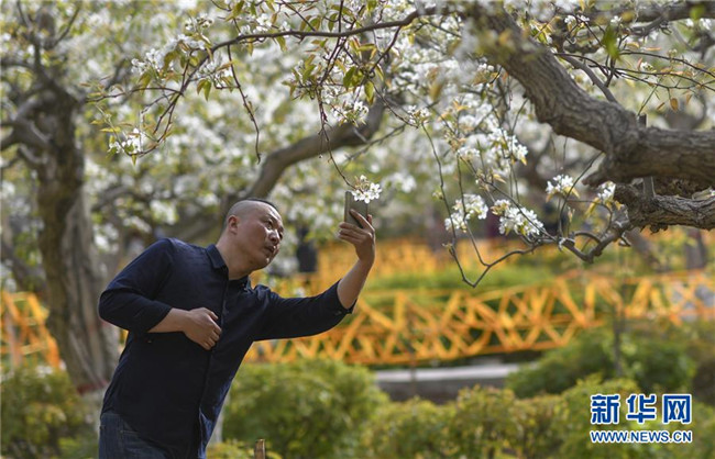 4月9日,一名市民在庫爾勒市梨香園中拍照。  新華社記者趙戈攝