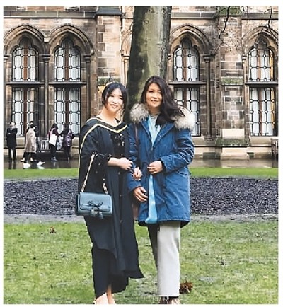 趙文琦身穿碩士服,與媽媽在英國校園中留影。