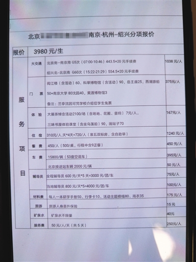 學(xué)生家長提供的北京某中學(xué)初一年級南方研學(xué)游報(bào)價明細(xì)。記者 黃哲程 攝