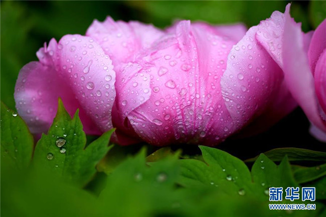 這是在石家莊市正定榮國府影視基地拍攝的牡丹花(4月13日攝)。時下,河北石家莊正定榮國府影視基地內的牡丹花次第開放,在春雨的滋潤下顯得格外晶瑩剔透、美麗嬌艷。 新華社發(fā)(陳其保 攝)