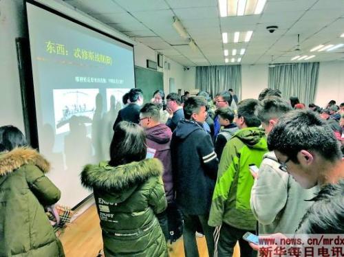 周四晚上7點(diǎn),武漢大學(xué)教5樓的404教室,前門開著,有幾個(gè)學(xué)生站到了走廊里,頭朝教室里面看著;后門也開著,卻也被幾個(gè)站著的學(xué)生堵上了。從走廊踮腳往里看,教室四周站了一圈學(xué)生,手里捧著筆記本;過道里也坐著學(xué)生,抱著書包,聚精會(huì)神地看向黑板。