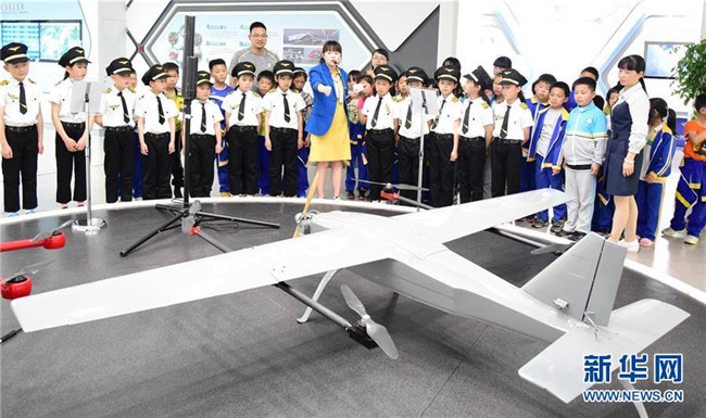 4月23日,浙江省建德市壽昌第二小學(xué)的學(xué)生們在航空小鎮(zhèn)科普展示廳內(nèi)參觀。新華社發(fā)(寧文武 攝)