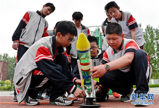 4月24日,河北省廊坊市第十三中學學生在安裝調(diào)試水火箭。當日是中國航天日,河北省廊坊市第十三中學舉辦航天主題活動,通過讓學生了解水火箭發(fā)射原理,體驗水火箭發(fā)射過程,激發(fā)學生科學探索精神。 新華社記者 王曉 攝