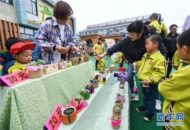 4月28日,家長(zhǎng)帶著孩子們?cè)谔暨x用廢舊罐子等作花盆的小盆栽。 新華社記者 徐昱 攝