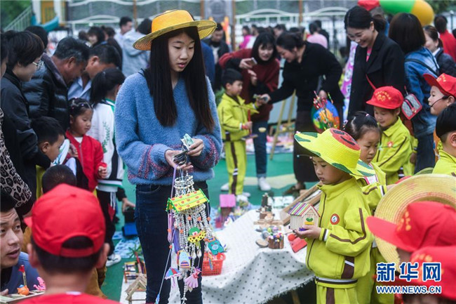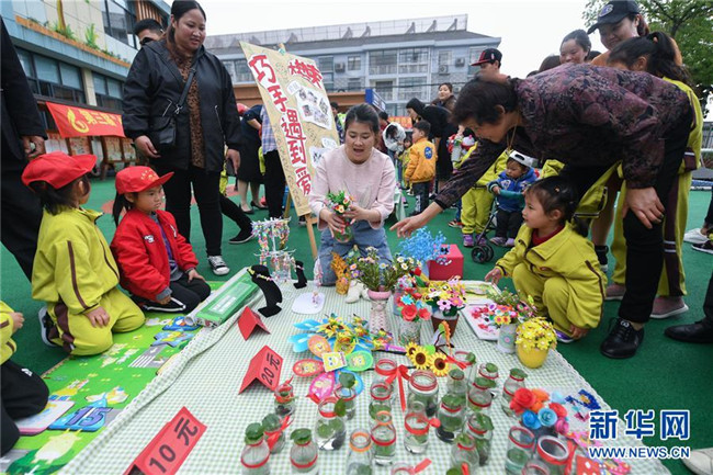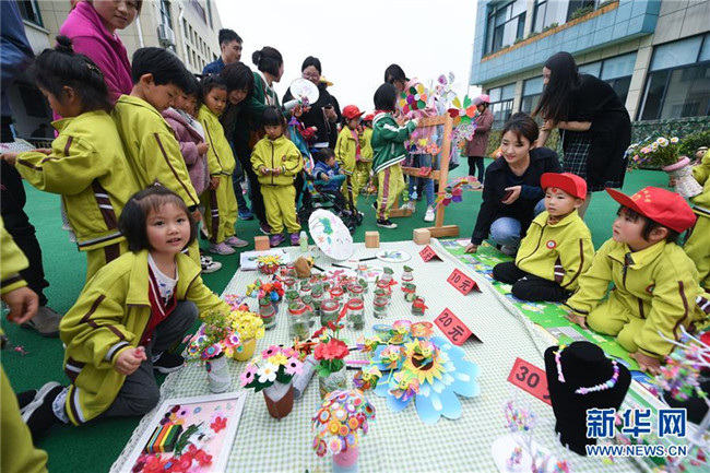 當(dāng)日,浙江省長(zhǎng)興縣畫(huà)溪街道包橋中心幼兒園舉辦校園義賣節(jié)。10多個(gè)攤位上擺放著家長(zhǎng)和孩子一起用廢舊的玻璃瓶、雪糕棍、紙盒、紐扣等廢舊材料制作而成的小木屋、迷你小盆栽、紐扣花束、風(fēng)車等手工作品,孩子們以班級(jí)為單位進(jìn)行手工作品義賣,所得款項(xiàng)將全部用于社區(qū)公益環(huán)?;顒?dòng)。主辦方介紹,希望通過(guò)這樣的活動(dòng),倡導(dǎo)廢物利用和綠色低碳的生活理念。