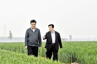 國務院發(fā)展研究中心專家、大名縣掛職縣委常委、副縣長吳平(左)與萬北村黨總支書記董可志探討萬北村鄉(xiāng)村振興發(fā)展之路。 記者 耿輝攝