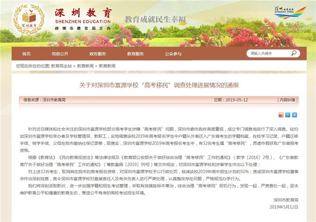 深圳市教育局網(wǎng)站12日發(fā)布《關(guān)于對深圳市富源學(xué)校“高考移民”調(diào)查處理進(jìn)展情況的通報》(以下簡稱《通報》)。《通報》指出:經(jīng)查實(shí),深圳市富源學(xué)校2019年高考報名考生中,有32名考生屬“高考移民”,弄虛作假獲取廣東省報考資格。將取消此32名考生在深圳市的高考報名資格。
