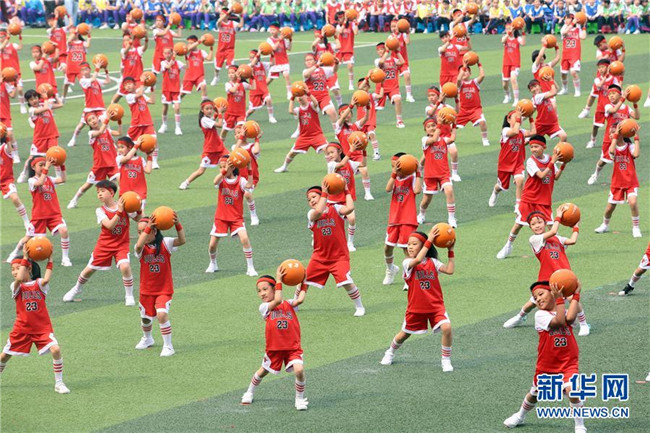 5月12日,天津市和平區(qū)岳陽道小學(xué)學(xué)生在運(yùn)動(dòng)會(huì)上展示集體籃球操。
