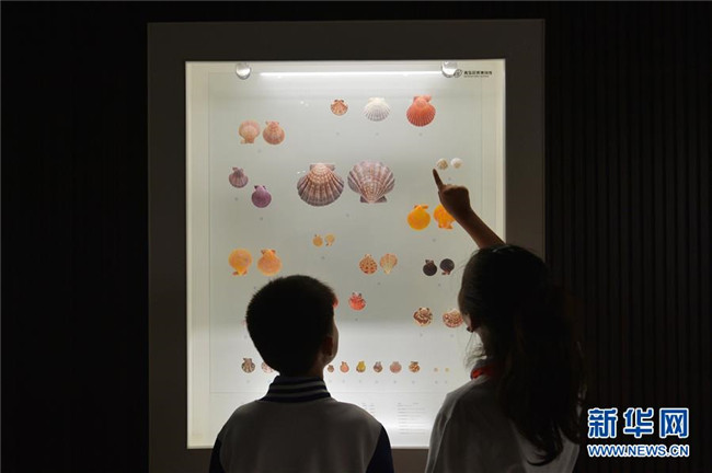 5月16日,兩名學(xué)生在青島貝殼博物館參觀展示的扇貝。新華社發(fā)(王海濱 攝)