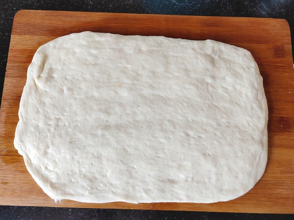 5.輕拍面團按扁,搟成長薄餅狀。