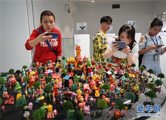 5月24日,觀眾在畢業(yè)生作品展上參觀綜合材料作品《游園會(huì)》。
