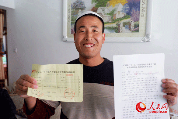 (馬沙力哈向記者展示他家的易地扶貧搬遷手續(xù)。人民網(wǎng) 張桂貴/攝)