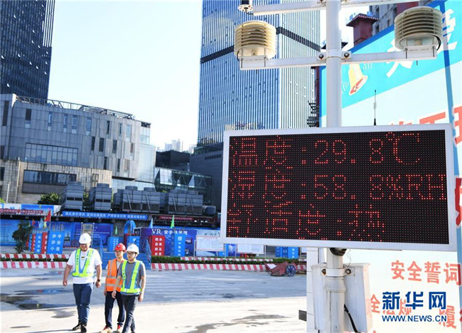 這是6月5日在重慶化龍橋超高層項(xiàng)目施工現(xiàn)場(chǎng)拍攝的環(huán)境監(jiān)測(cè)系統(tǒng)顯示屏。新華社記者 王全超 攝