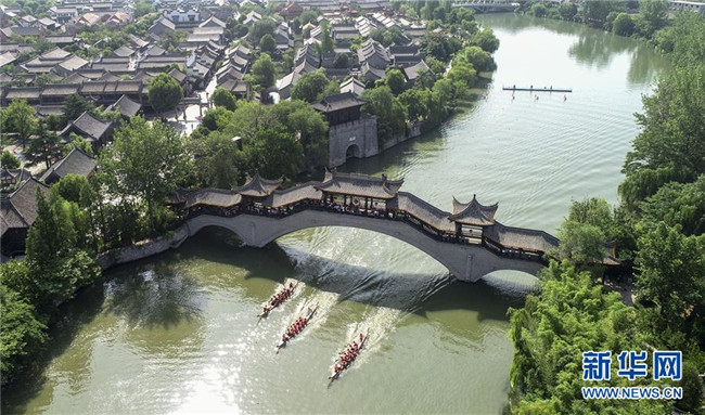人們在山東省棗莊市臺兒莊古城古運河道上劃龍舟(2019年6月7日無人機拍攝)。 新華社發(fā)(高啟民 攝)
