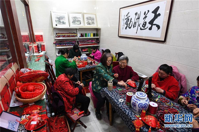 在江蘇省徐州市潘安湖國家濕地公園內的香包工作室,王秀英老人與村民們一起制作香包(2018年1月17日攝)。新華社記者 季春鵬 攝