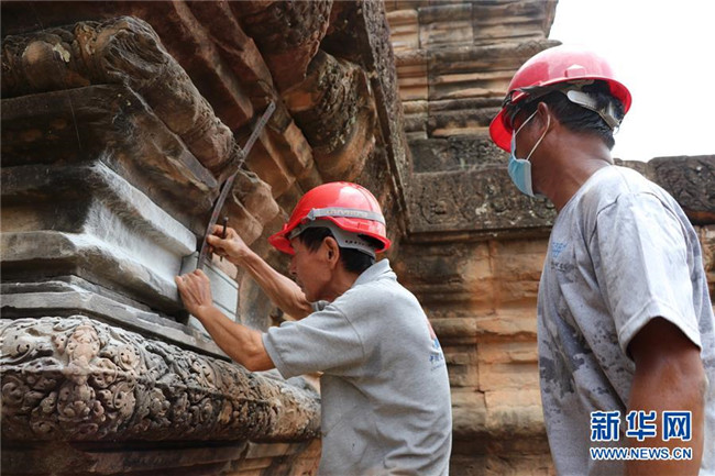 在柬埔寨暹粒,中國——柬埔寨政府吳哥古跡保護工作隊進行茶膠寺保護修復項目的結項收尾工作(2018年7月9日攝)。新華社記者 毛鵬飛 攝
