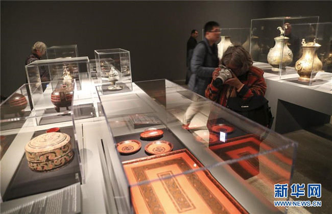 在美國紐約大都會博物館,參觀者在大型展覽“秦漢文明”媒體預展上拍攝展品(2017年3月27日攝)。