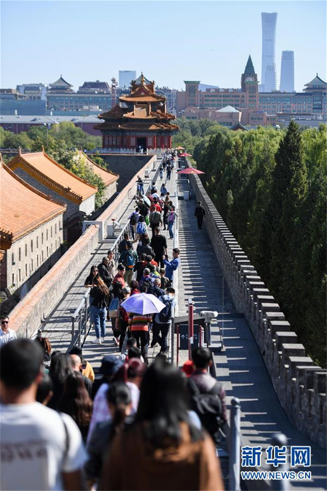 游客在北京故宮南城墻上參觀(2018年10月7日攝)。 新華社記者 陳曄華 攝