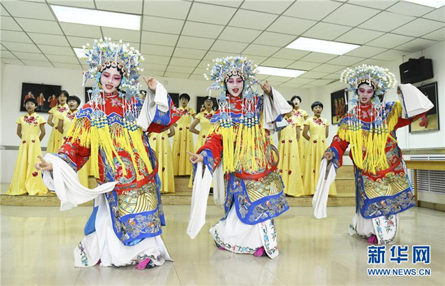 在河北省石家莊市第四十四中學,學生在為定期舉辦的河北梆子合唱節(jié)排練(2019年5月16日攝)。新華社發(fā)(陳其保 攝)