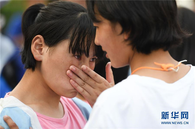 6月9日,合肥市第三十五中學(xué)西藏班的初三畢業(yè)生(右)與老師告別時落淚。