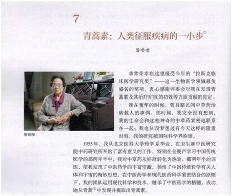據(jù)悉,今年秋季學期將開始推廣的統(tǒng)編高中語文教材已確定將屠呦呦2011年的獲獎感言及同年發(fā)表的論文改編成課文《青蒿素:人類征服疾病的一小步》。人民教育出版社有關(guān)負責人介紹,屠呦呦在青年時期培養(yǎng)了對傳統(tǒng)醫(yī)藥學的熱愛,歷經(jīng)數(shù)年終于從古代藥典中獲得靈感,發(fā)現(xiàn)了青蒿素,并且至今仍在科學探索道路上孜孜以求。此次選錄這篇文章,旨在引導學生了解和尊重科學,從屠呦呦的科研歷程中汲取力量。