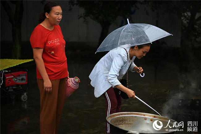 6月19日,宜賓長寧地震后的第二個清晨,安置點正在發(fā)放免費早餐。(人民網(wǎng) 朱虹 攝)