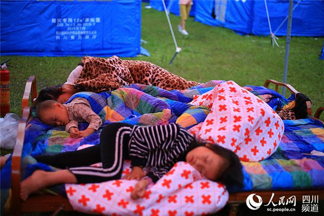 6月19日,宜賓長寧地震后的第二個清晨,安置點內(nèi)還在熟睡的小朋友。(人民網(wǎng) 朱虹 攝)