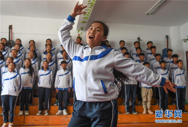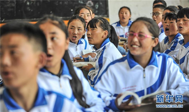 鹽井中學的學生們在上藏文課(6月6日攝)。年輕的藏族女教師坐在鋼琴前,手指靈動地彈奏樂曲,兩名學生拉起弦子伴奏,三十多名學生站成四排,齊聲合唱。學校籃球場上數(shù)名身材高大的學生,正在體育老師的組織下進行激烈的分組對抗,不一會兒,學生們個個汗流浹背。綜合樓三樓的化學實驗室內(nèi),身穿白色大褂的學生,分成若干小組,正在做簡單的化學實驗。這一幕幕,同時出現(xiàn)在西藏昌都市芒康縣鹽井中學。新華社記者晉美多吉攝