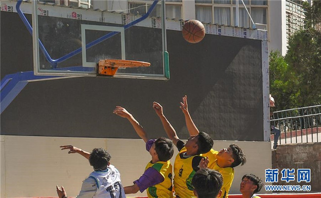 鹽井中學的學生們在體育課上打籃球(6月6日攝)。年輕的藏族女教師坐在鋼琴前,手指靈動地彈奏樂曲,兩名學生拉起弦子伴奏,三十多名學生站成四排,齊聲合唱。學?;@球場上數(shù)名身材高大的學生,正在體育老師的組織下進行激烈的分組對抗,不一會兒,學生們個個汗流浹背。綜合樓三樓的化學實驗室內(nèi),身穿白色大褂的學生,分成若干小組,正在做簡單的化學實驗。這一幕幕,同時出現(xiàn)在西藏昌都市芒康縣鹽井中學。新華社記者晉美多吉攝