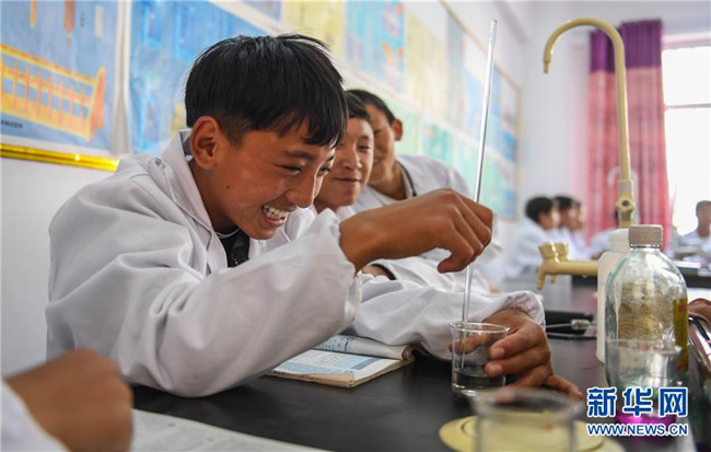 鹽井中學的學生們在上化學課(6月6日攝)。年輕的藏族女教師坐在鋼琴前,手指靈動地彈奏樂曲,兩名學生拉起弦子伴奏,三十多名學生站成四排,齊聲合唱。學?;@球場上數(shù)名身材高大的學生,正在體育老師的組織下進行激烈的分組對抗,不一會兒,學生們個個汗流浹背。綜合樓三樓的化學實驗室內(nèi),身穿白色大褂的學生,分成若干小組,正在做簡單的化學實驗。這一幕幕,同時出現(xiàn)在西藏昌都市芒康縣鹽井中學。新華社記者晉美多吉攝