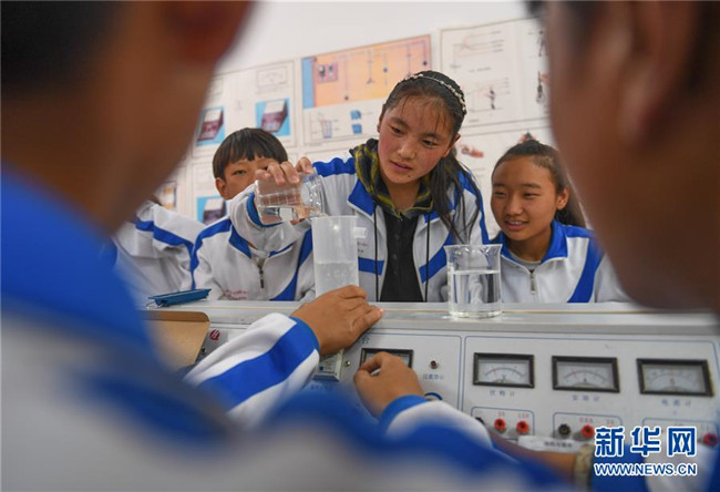 鹽井中學的學生們在上物理課(6月6日攝)。年輕的藏族女教師坐在鋼琴前,手指靈動地彈奏樂曲,兩名學生拉起弦子伴奏,三十多名學生站成四排,齊聲合唱。學?;@球場上數(shù)名身材高大的學生,正在體育老師的組織下進行激烈的分組對抗,不一會兒,學生們個個汗流浹背。綜合樓三樓的化學實驗室內(nèi),身穿白色大褂的學生,分成若干小組,正在做簡單的化學實驗。這一幕幕,同時出現(xiàn)在西藏昌都市芒康縣鹽井中學。新華社記者晉美多吉攝