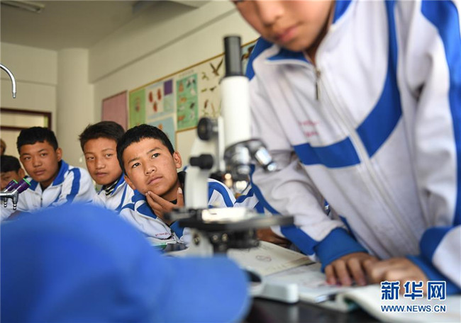 鹽井中學的學生們在上生物課(6月6日攝)。年輕的藏族女教師坐在鋼琴前,手指靈動地彈奏樂曲,兩名學生拉起弦子伴奏,三十多名學生站成四排,齊聲合唱。學校籃球場上數(shù)名身材高大的學生,正在體育老師的組織下進行激烈的分組對抗,不一會兒,學生們個個汗流浹背。綜合樓三樓的化學實驗室內(nèi),身穿白色大褂的學生,分成若干小組,正在做簡單的化學實驗。這一幕幕,同時出現(xiàn)在西藏昌都市芒康縣鹽井中學。新華社記者晉美多吉攝