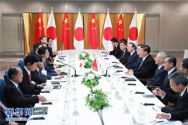 習(xí)近平強(qiáng)調(diào),雙方要始終恪守中日四個(gè)政治文件確立的各項(xiàng)原則,踐行中日“互為合作伙伴、互不構(gòu)成威脅”的政治共識(shí),增進(jìn)互信,推動(dòng)中日關(guān)系始終沿著和平、友好、合作的正確軌道持續(xù)向前發(fā)展。要深化經(jīng)貿(mào)、投資、第三方市場(chǎng)、科技創(chuàng)新等廣泛領(lǐng)域合作,打造新的合作增長(zhǎng)點(diǎn),積極引領(lǐng)區(qū)域經(jīng)濟(jì)一體化。我們歡迎日本企業(yè)積極擴(kuò)大對(duì)華合作,分享中國(guó)發(fā)展新機(jī)遇。共建“一帶一路”倡議為中日互利合作開(kāi)辟了廣闊天地,歡迎日方積極參與。雙方要拉緊人文紐帶,加強(qiáng)兩國(guó)青少年交流,促進(jìn)兩國(guó)民眾相知相親。我贊同年內(nèi)啟動(dòng)中日高級(jí)別人文交流磋商機(jī)制。要通過(guò)對(duì)話協(xié)商建設(shè)性管控矛盾分歧,加強(qiáng)外交和安全領(lǐng)域?qū)υ挘瑯?gòu)建建設(shè)性雙邊安全關(guān)系。希望日方恪守迄今共識(shí)和承諾,妥善處理好歷史等敏感問(wèn)題,共同維護(hù)東海和平穩(wěn)定。中日應(yīng)該加強(qiáng)在國(guó)際和地區(qū)事務(wù)中的溝通、協(xié)調(diào)、合作,共同應(yīng)對(duì)全球性挑戰(zhàn),推動(dòng)全球治理更加公正合理。中方支持日方辦好二十國(guó)集團(tuán)領(lǐng)導(dǎo)人大阪峰會(huì),期待峰會(huì)發(fā)出維護(hù)多邊主義和自由貿(mào)易的明確聲音,為世界經(jīng)濟(jì)發(fā)展注入穩(wěn)定預(yù)期和動(dòng)力。