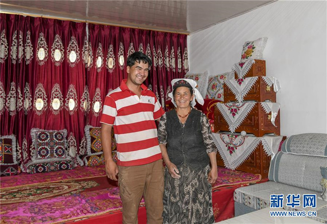 這是在新疆塔什庫爾干塔吉克自治縣大同鄉(xiāng)的一處易地扶貧搬遷安置點安居房內(nèi)拍攝的古力西爾汗·阿迪那買買提與母親的合影(6月18日攝)。他家已于2018年脫貧。新華社記者胡虎虎攝