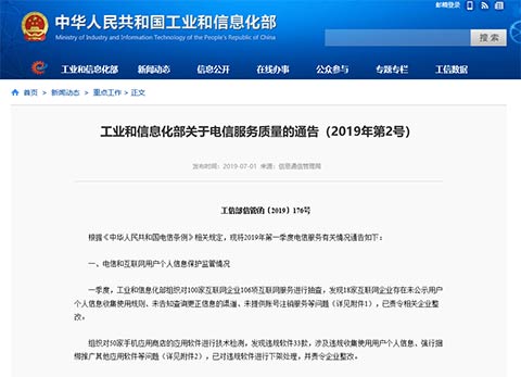 通告稱,一季度,工信部對100家互聯(lián)網(wǎng)企業(yè)106項互聯(lián)網(wǎng)服務(wù)進行抽查,發(fā)現(xiàn)18家互聯(lián)網(wǎng)企業(yè)存在未公示用戶個人信息收集使用規(guī)則、未告知查詢更正信息的渠道、未提供賬號注銷服務(wù)等問題,工信部已責令相關(guān)企業(yè)整改。