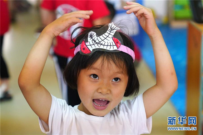 7月4日,小朋友在游戲中頭戴分類垃圾的圖案。新華社記者 張宏祥 攝