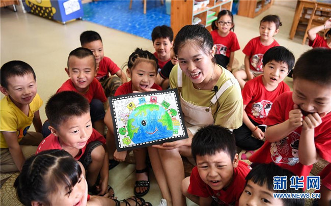 7月4日,德清縣乾元鎮(zhèn)第一幼兒園老師向孩子們講解環(huán)保知識(shí)。新華社記者 鄧華 攝