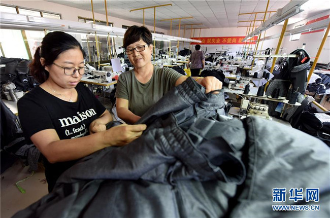7月9日,河北臨城縣西鴨鴿營村村民在當(dāng)?shù)匾?ldquo;扶貧車間”檢查服裝成品質(zhì)量。新華社記者 朱旭東 攝
