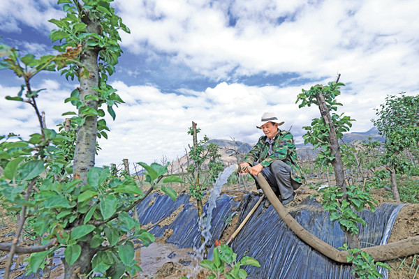 圖為苗木基地工作人員在為苗圃澆水。通訊員 洛??酥?記者 唐斌 攝