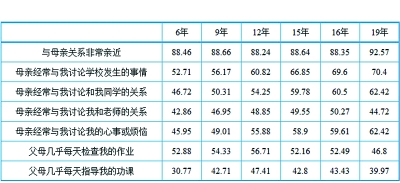 高學(xué)歷父母檢查作業(yè)的頻次不高。如果以父母教育水平作為社會階層的劃分依據(jù),數(shù)據(jù)顯示,社會階層越高的父母陪伴子女高頻率參加文化活動的比重越大。例如,父母雙方受教育程度最大為“大學(xué)及以上”的學(xué)生中有16.69%的人表示“上個月與父母外出看電影、演出、體育比賽的頻率為每周兩次以上”,相比之下父母雙方受教育程度最大為“小學(xué)”的學(xué)生中只有8.65%的人報(bào)告此選項(xiàng)。而且社會階層越高的父母和子女的關(guān)系越親近。例如,母親受教育年限為19年的學(xué)生中有92.57%的人選擇了“我和媽媽的關(guān)系非常親近”;70.40%的人表示“母親經(jīng)常與我討論學(xué)校發(fā)生的事情”;62.42%的人認(rèn)為“母親經(jīng)常與我討論我的心事或煩惱”。