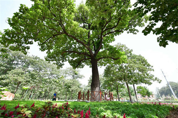 游客從蘭考焦裕祿干部學(xué)院門口的“焦桐”下走過(2017年8月9日攝)。這棵泡桐是焦裕祿當(dāng)年親手種下,被人們稱為“焦桐”。
